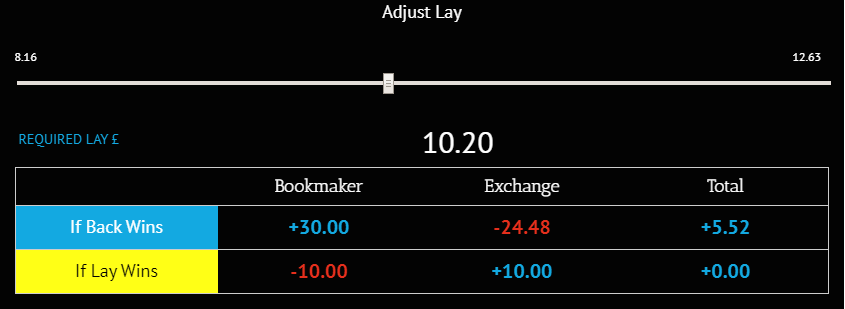 As we can see by the matched betting calculator, if we place a £10.00 back bet on Leicester, Chelsea and Burnley all to win at odds of 4.0 and place a lay bet of £11.38 at odds of 3.40 on the treble we make a guaranteed profit of £1.59. However, we can make a higher, risk free shot by underlaying the selection, but if the accumulator lose’s we will not make a profit. To do this we can adjust the Slider on the Matched Betting Calculator like the image below. This means we can have a risk free shot at £5.52.