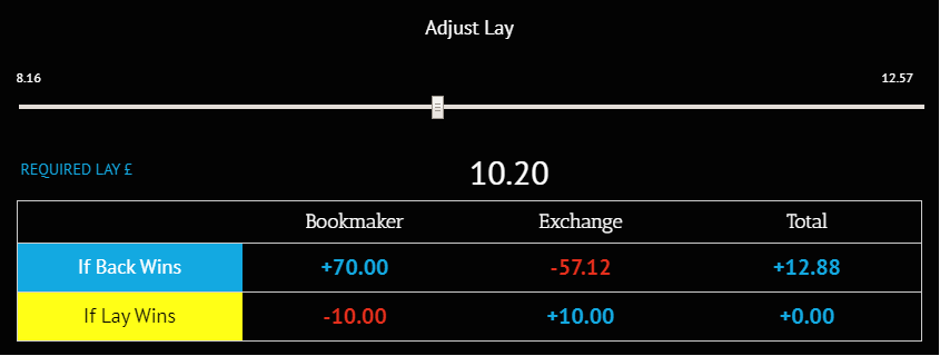 As we can see by the matched betting calculator, if we place a £10.00 back bet on Brentford, Stoke and Cardiff all to win at odds of 8.0 and place a lay bet of £12.16 at odds of 6.6 on the treble we make a guaranteed profit of £1.90. However, we can make a higher, risk free shot by underlaying the selection, but if the accumulator lose’s we will not make a profit. To do this we can adjust the Slider on the Matched Betting Calculator like the image below. This means we can have a risk free shot at £12.88