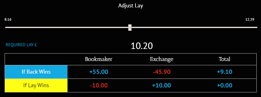As we can see by the matched betting calculator, if we place a £10.00 back bet on Chelsea, West Brom and Fulham all to win at odds of 6.5 and place a lay bet of £11.86 at odds of 5.5 on the treble we make a guaranteed profit of £1.62. However, we can make a higher, risk free shot by underlaying the selection, but if the accumulator lose’s we will not make a profit. To do this we can adjust the Slider on the Matched Betting Calculator like the image below. This means we can have a risk free shot at £9.10.