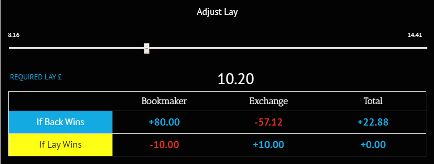 As we can see by the matched betting calculator, if we place a £10.00 back bet on Wolves, Celtic and Aston Villa all to win at odds of 9.0 and place a lay bet of £13.68 at odds of 6.6 on the treble we make a guaranteed profit of £3.39. However, we can make a higher, risk free shot by underlaying the selection, but if the accumulator lose’s we will not make a profit. To do this we can adjust the Slider on the Matched Betting Calculator like the image below. This means we can have a risk free shot at £22.88.