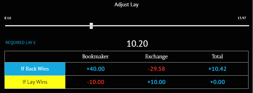 As we can see by the matched betting calculator, if we place a £10.00 back bet on Chelsea, Leeds United and Benfica all to win on Tuesday at odds of 5.0 and place a lay bet of £12.89 at odds of 3.9 on the treble we make a guaranteed profit of £2.62. However, we can make a higher, risk free shot by underlaying the selection, but if the accumulator lose’s we will not make a profit. To do this we can adjust the Slider on the Matched Betting Calculator like the image below. This means we can have a risk free shot at £10.42.