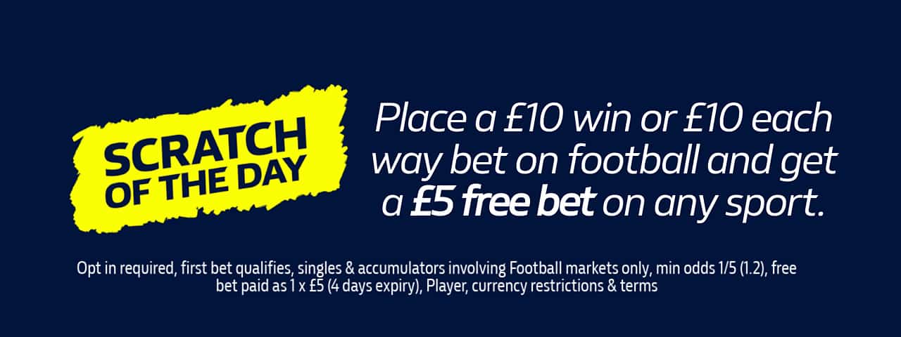 It’s Saturday and William Hill are giving us a free Scratch of the Day. Today’s offer is simple: Stake £10.00 on Football and William Hill will give us a £5.00 free bet! This guarantees us a quick and easy profit of at least £3.70!