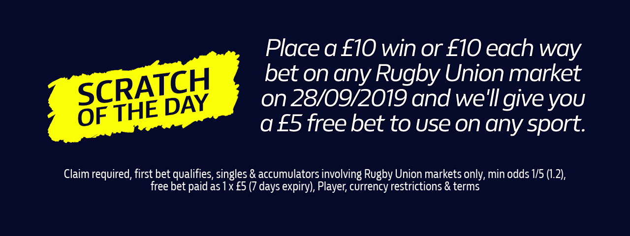 - Minimum stake of £10.00 or £10.00 each way on any Rugby Union market up until 23.59 on Saturday 28th September 2019.
