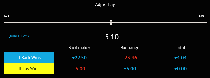 As we can see by the matched betting calculator, if we place a £5.00 back bet on Wolves, Leeds and Celtic all to win at odds of 6.5 and place a lay bet of £5.82 at odds of 5.6 on the treble we make a guaranteed profit of £0.70. However, we can make a higher, risk free shot by underlaying the selection, but if the accumulator lose’s we will not make a profit. To do this we can adjust the slider on the matched betting calculator like the image below. This means we can have a risk free shot at £4.04.